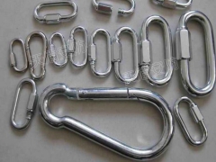 安全钩,也叫“主锁”,分普通式(旋转式)和弹簧钩(自锁式)两种。外形多如“D”(救援、军事)、“8”字形(工程、建筑)。