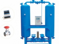 无热吸干机综合变压吸附和变温吸附之优点,在常温高蒸汽分压下吸附(工作);在较高温度,低蒸汽分压下解析(生),即吸附剂在吸附过程中吸附的水份,在再生过程依靠高品质再生产(干燥空气加热)的热扩散和低分压两种机理的共同作用而得以彻底清除。吸附湿空气从下管系经A1阀进入A干燥罐体,自下向上流过吸附剂床,干燥后的空气从上管系排出。再生/吹冷 少量干燥空气(约7%)通过上管系再生气调节阀减压后进入加热器加热,这部分热空气(称为再生气)进入B干燥罐。对B罐体内的吸附剂解析再生,恢复吸附剂的干燥能力,再生气通过下管系B2阀排放到大气中。均压吸附剂再生结束后,B2阀关闭,B干燥罐逐渐升压至在线工作压力,准备切换。切换下管系B1阀打开,A1阀关闭,A2阀打开,A、B两干燥罐完成切换,B罐进入吸附,A罐卸压再生。工作顺序、工作时间及加热温度由控制器自动控制完成.
