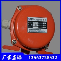 双向拉绳开关采用回转式凸轮结构。当拉杆手回转时,凸轮随之转动,使微动开关动作,输出开关量,发出报警信号和停机信号。复位方式I型为自动复位,拉杆解除拉力后,凸轮结构自动复位到原始状态。II型为手工复位,凸轮轴回转到一定角度自锁定位,需手工复位手柄后凸轮方能返回原始状态。双向拉绳开关采用防水、防尘密封设计,较好防止水、灰尘进入机壳内。