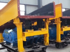 3、台车上的操纵机构、绞车、导向轮和进料槽、中间槽、卸载槽。进料槽的中部设有升降装置,可旋转螺杆调节簸箕口的高低,为了引导耙斗进出和防止矸石撒落,在绞接部位还设有左右导向挡板;中间槽前后弯曲部位,各设有可装卸耐磨的弧形板;卸载槽后部装有缓冲作用的弹簧碰头和撑脚。