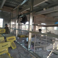 (3)隔墙铺板时,一般采用纵向铺设,即板的长边固定于竖龙骨上;板材对接时要自然靠近,不能强压就位;墙体两面的接缝应相互错开,不能落在同一根龙骨上